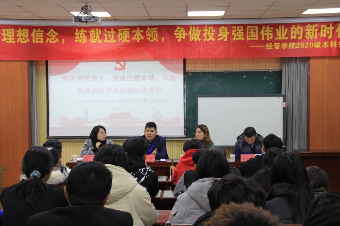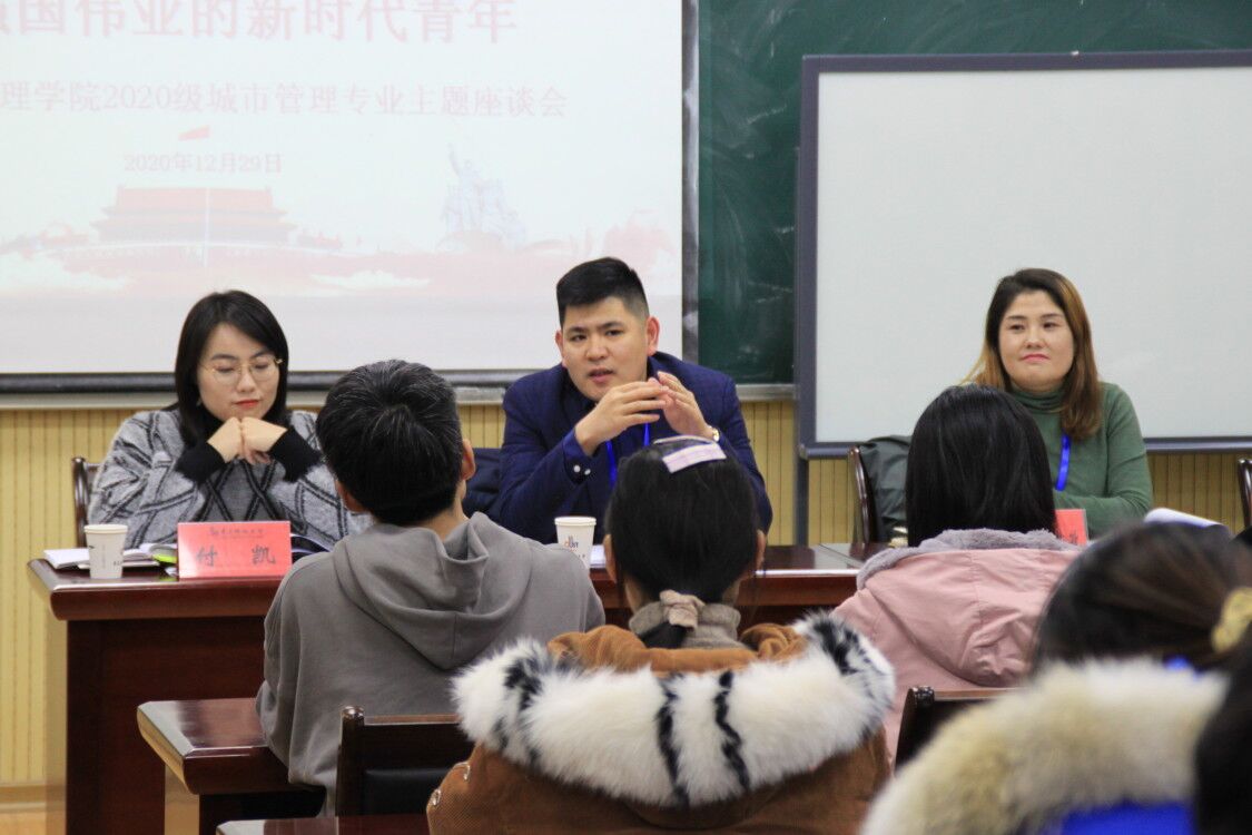 为积极响应学校机关处级干部联系学生班级通知精神,落实立德树人根本任务,进一步提升学生管理水平,促进学生成长成才,12月29日下午,tyc1286太阳成集团2020城市管理专业“坚定理想信念,练就过硬本领,争做投身强国伟业的新时代青年”主题座谈会于经管楼419会议室举行,党委(校长)办公室副主任王帅、学生工作处少数民族办公室辅导员热孜亚·茹孜、城市管理专业20级班主任祝晓波出席此次会议,座谈会由20级辅导员付凯主持,城市管理专业全体同学参加。