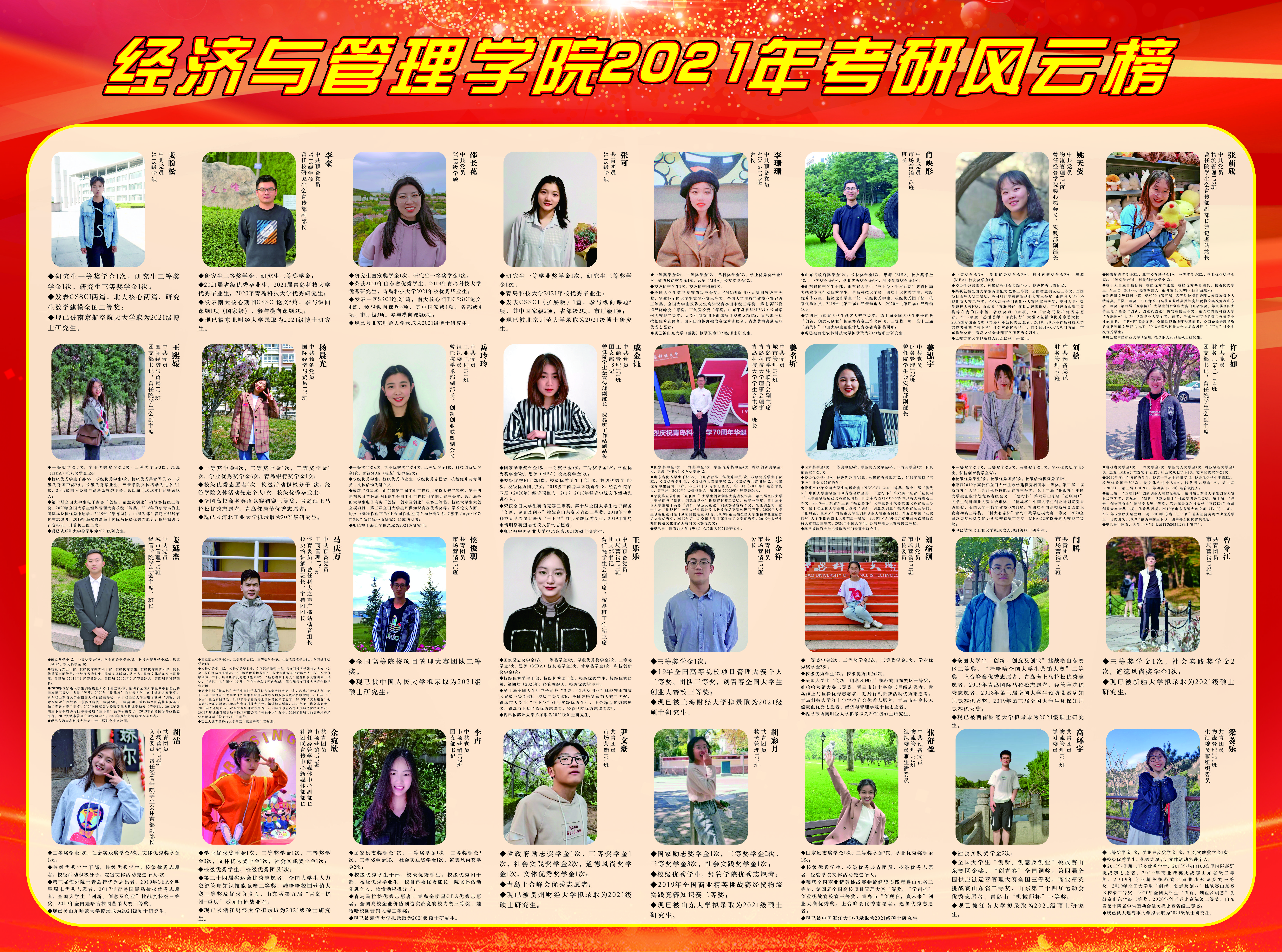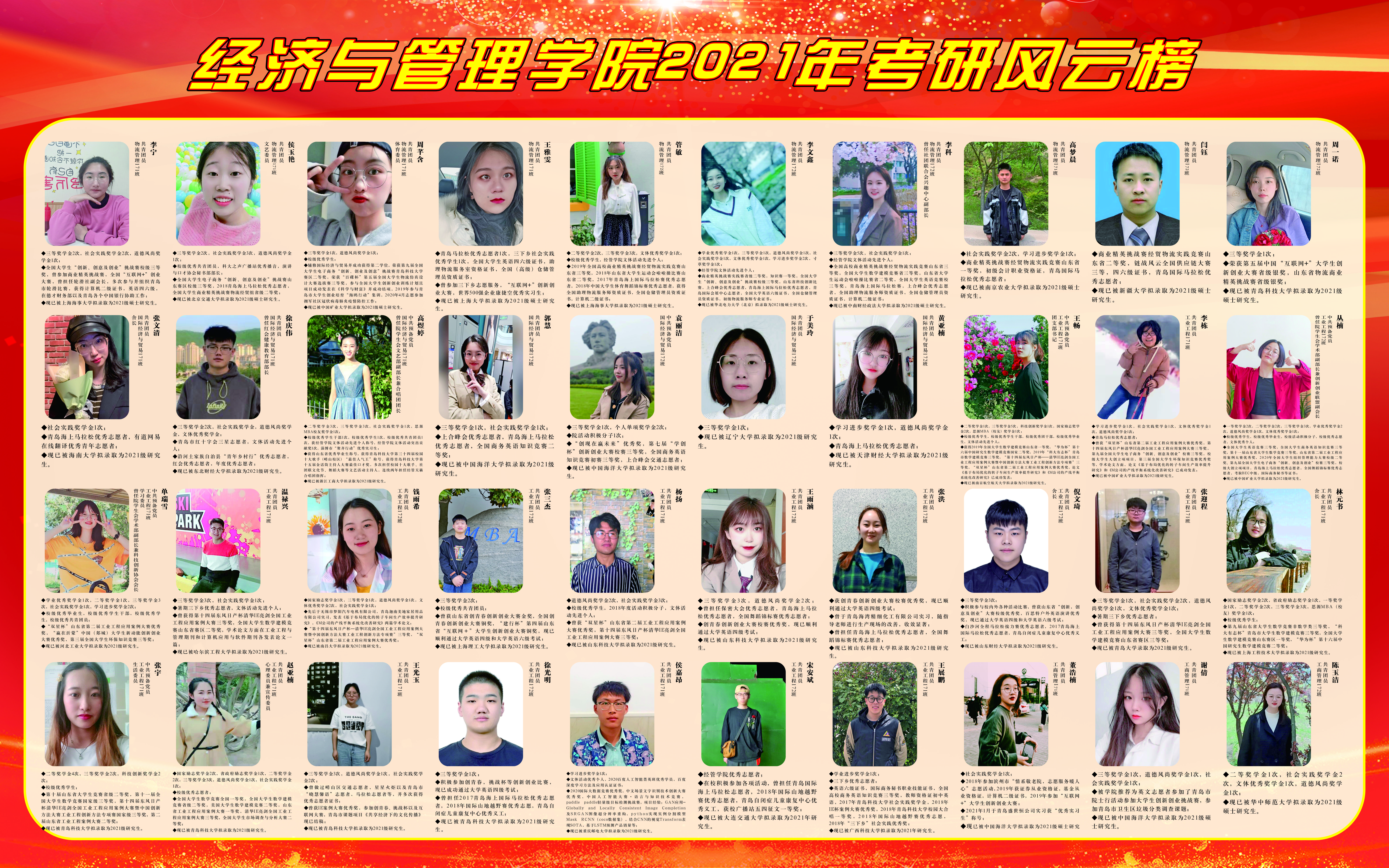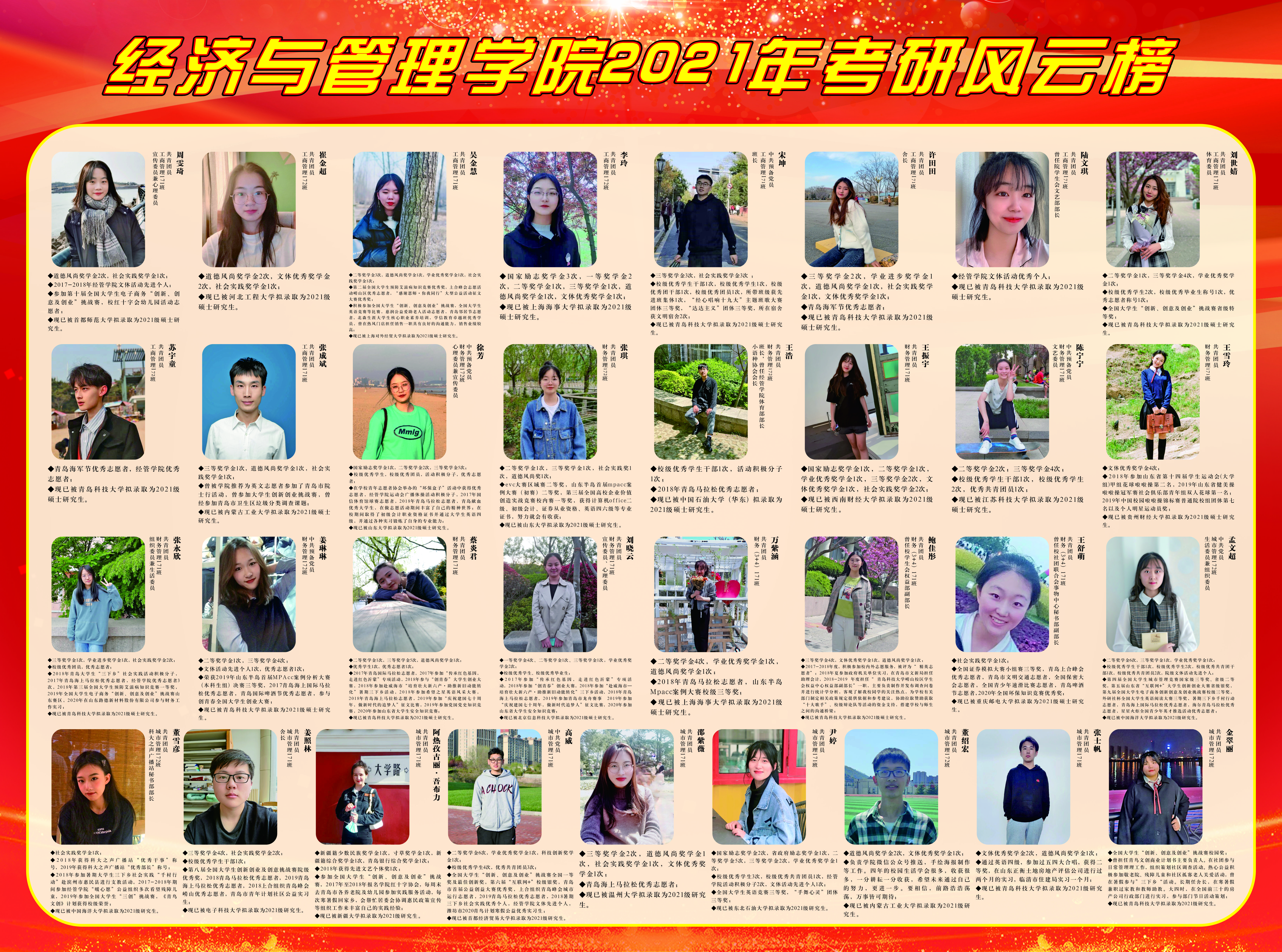 披星戴月,四季奔忙,只因理想,乘风破浪。在太阳成集团领导的大力关心与指导下,在全体教师的帮助与支持下,在全体学生的共同努力下,tyc1286太阳成集团2021届毕业生在全国研究生考试中不负众望,再创佳绩。为传递优秀学子的榜样力量,弘扬学风建设正能量,tyc1286太阳成集团组织考研风云榜展示活动,旨在彰显经管精神、传递经管声音。