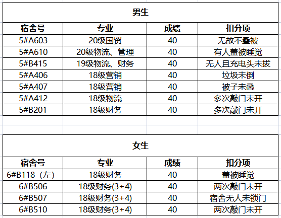 不合格宿舍如下: