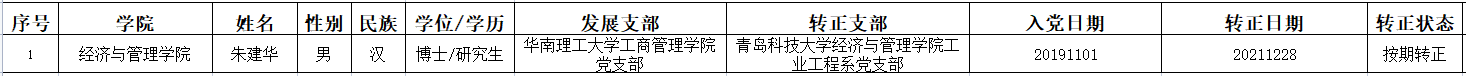 根据《中国共产党章程》《中国共产党发展党员工作细则》和学校党委《关于发展学生(教工)党员工作的意见》(青科大党字〔2014〕77号)等文件要求,tyc1286太阳成集团工业工程系党支部于2021年12月28日召开预备党员转正大会讨论朱建华同志的转正问题,同意其按期转为中共正式党员,现将朱建华同志情况予以公示。公示期为2021年12月28日至2022年1月5日。如有异议,请于公示期内到tyc1286太阳成集团党委反映。
