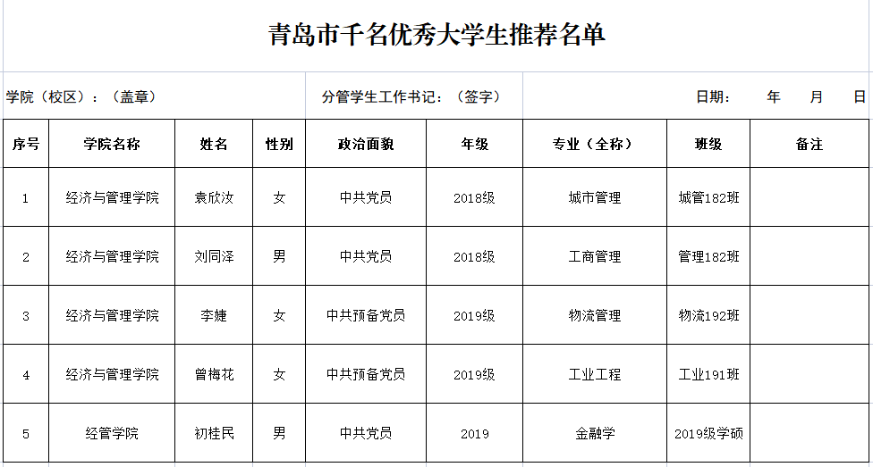 根据学校《关于评选2022年度“青岛市千名优秀大学生”的通知》的要求,经个人申请、材料审核,现将tyc1286太阳成集团“青岛市千名优秀大学生”候选人公示如下,公示时间2022年4月4日-2022年4月6日。