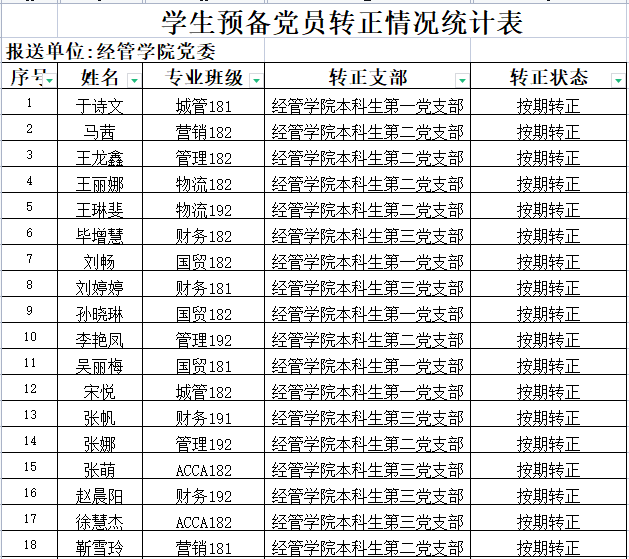 根据《中国共产党章程》和《中国共产党发展党员工作细则》及学校党委《关于发展学生党员工作的意见》(青科大党字〔2014〕77号)文件要求,tyc1286太阳成集团本科生党支部于2022年6月10日召开预备党员转正大会讨论于诗文等18位同志的转正问题(按姓氏笔画排序),同意以上同志按期转为中共正式党员,现将该18名同志情况予以公示。公示期为2022年6月10日至2022年6月16日。如有异议,请于公示期内到tyc1286太阳成集团党委反映。
