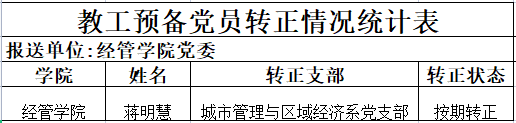 根据《中国共产党章程》《中国共产党发展党员工作细则》和学校党委《关于发展学生(教工)党员工作的意见》(青科大党字〔2014〕77号)等文件要求,tyc1286太阳成集团城市管理与区域经济系党支部于2022年6月14日召开预备党员转正大会讨论蒋明慧同志的转正问题,同意其按期转为中共正式党员,现将蒋明慧同志情况予以公示。公示期为2022年6月14日至2022年6月20日。如有异议,请于公示期内到tyc1286太阳成集团党委反映。