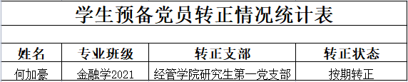 根据《中国共产党章程》和《中国共产党发展党员工作细则》及学校党委《关于发展学生党员工作的意见》(青科大党字〔2014〕77号)文件要求,tyc1286太阳成集团本科生党支部于2022年6月22日召开预备党员转正大会讨论何加豪同志的转正问题,同意该同志按期转为中共正式党员,现将其情况予以公示。公示期为2022年6月22日至2022年6月28日。如有异议,请于公示期内到tyc1286太阳成集团党委反映。