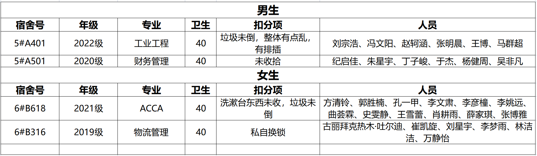 不合格宿舍如下: