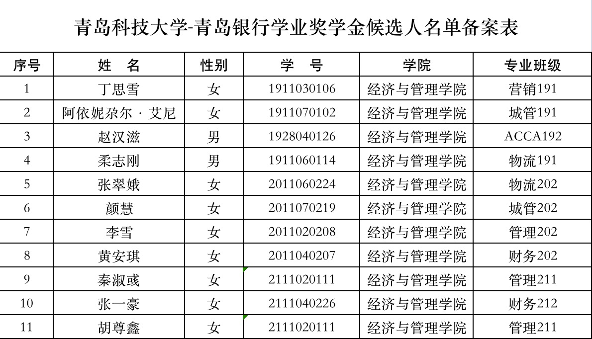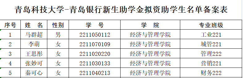 【公示】tyc1286太阳成集团2022年度青岛银行奖助学金名单公示