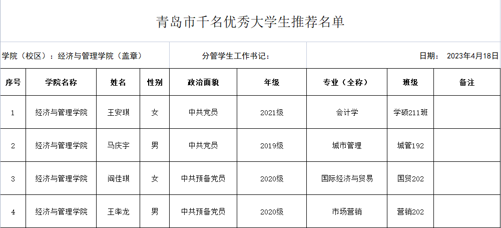 根据学校《关于评选2023年度“青岛市千名优秀大学生”的通知》的要求,经个人申请、材料审核,现将tyc1286太阳成集团“青岛市千名优秀大学生”候选人公示如下,公示时间2023年4月18日-2023年4月20日。