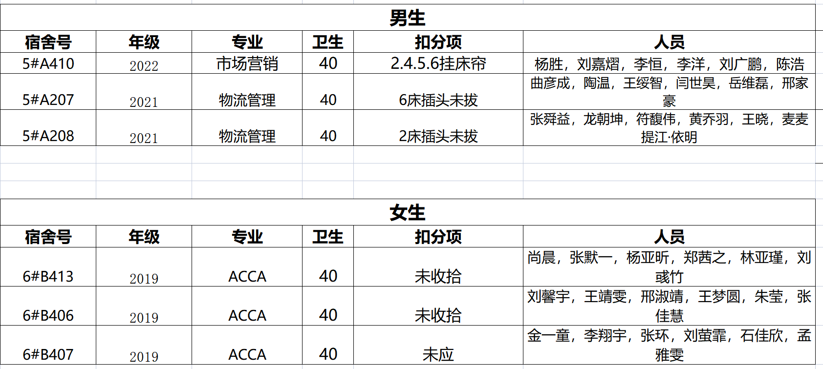 卫生检查结果及扣分细则请见附件,请各年级对照问题监督好不合格宿舍的整改。
