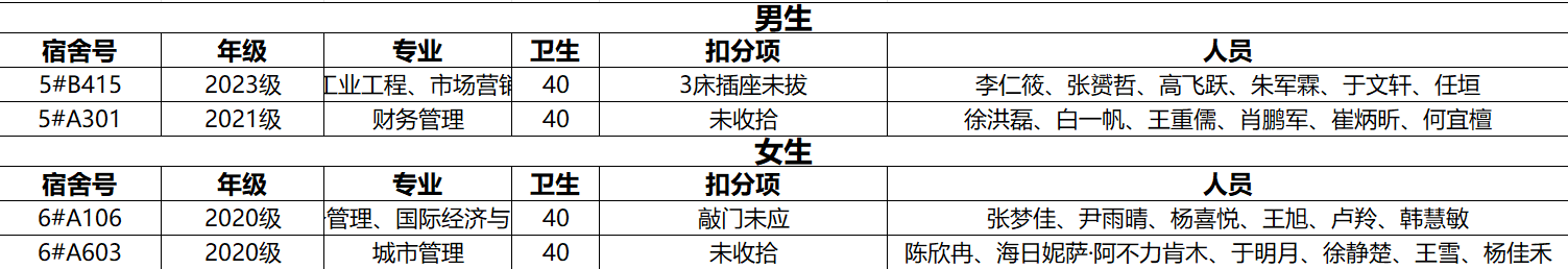 卫生检查结果及扣分细则请见附件,请各年级对照问题监督好不合格宿舍的整改。