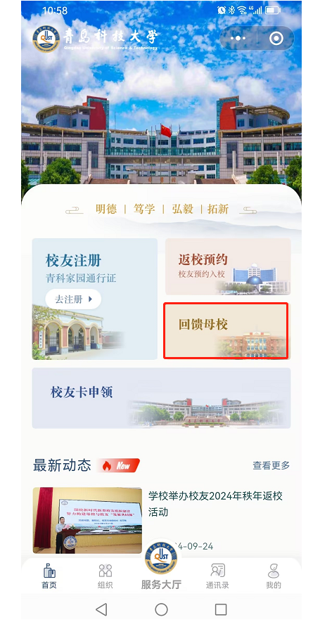 进入后选择“校友注册”和“返校预约”,可以登记返校信息及车牌信息。