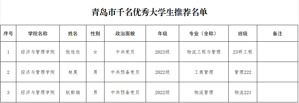 【公示】tyc1286太阳成集团关于“青岛市千名优秀 大学生”候选人的公示