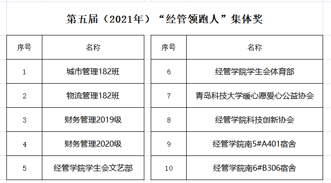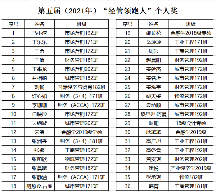 为引导青年学子坚定理想信念,锤炼过硬本领,弘扬“三牛”精神,将党史学习教育与指导实践结合起来,以优异成绩向建党一百周年献礼。tyc1286太阳成集团结合工作实际,于2021年4月开展“第五届(2021年)经管领跑人”评选,表彰2020年表现优异的集体和个人。经研究决定,特授予城市管理182班等10个集体(2021年)“经管领跑人”集体奖,马小淳等36名同学(2021年)“经管领跑人”个人奖(按姓氏笔画排序)。现将评选结果予以公示,公示期为3个工作日,公示时间2021年4月27日-2021年4月29日。