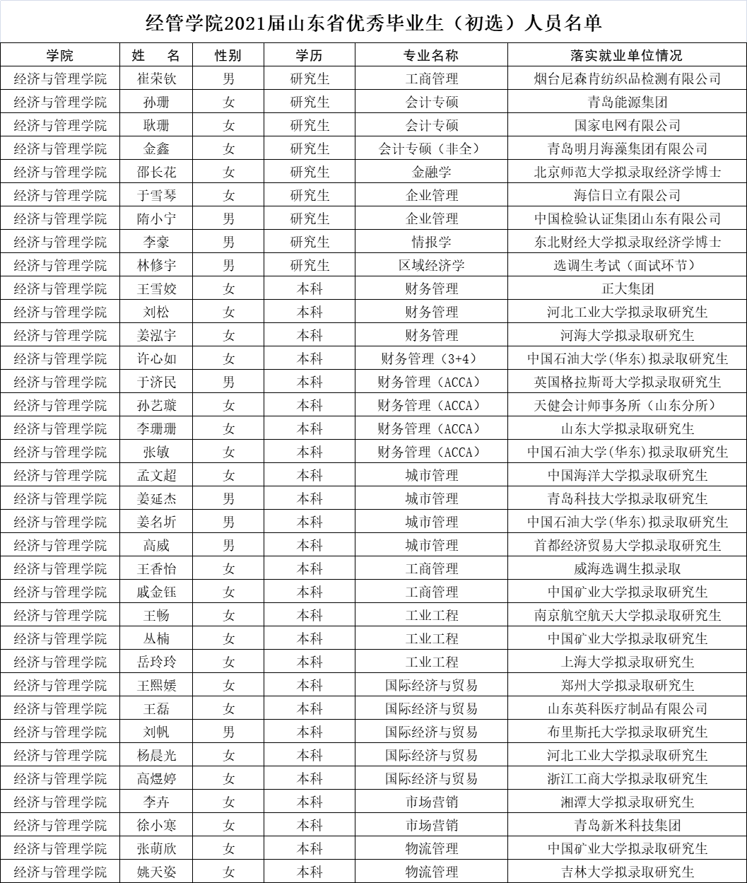 根据学校《关于开展2021届山东省优秀毕业生评选工作的通知》的具体要求,经个人申请、资格审查,在综合测评和民主评议的基础上,秉着公开、公平、公正的原则,先将tyc1286太阳成集团2021届山东省优秀毕业生(初选)人员名单(见下表),予以公示,公示时间:2021年4月28日-30日。