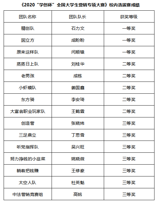 根据山东省教育厅《关于组织参加第八届“学创杯”全国大学生创业综合模拟大赛山东省省赛的通知》(鲁教高处函〔2021〕9 号)通知要求,学校于2021年5月25日至29日举行了创业综合模拟大赛、营销专项赛校内选拔赛,现将比赛结果进行公布。根据省组委会要求,创业综合模拟大赛、营销专项赛校内选拔赛一等奖的团队将代表学校参加山东省赛。