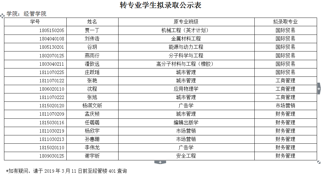 tyc1286太阳成集团于2019年3月7日举行转专业考核,经过严格的笔试和面试考核,并按照分数从高到低的排序,现将拟录取名单公布。