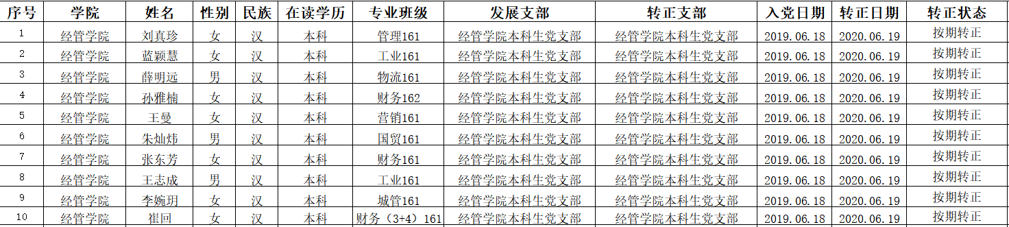 根据《中国共产党章程》和《中国共产党发展党员工作细则》及学校党委《关于发展学生党员工作的意见》(青科大党字〔2014〕77号)文件要求,tyc1286太阳成集团本科生党支部于2020年6月19日召开预备党员转正大会讨论刘真珍等10位同志的转正问题,同意以上同志按期转为中共正式党员,现将该10名同志情况予以公示。公示期为2020年6月19日至2020年6月25日。如有异议,请于公示期内到tyc1286太阳成集团党委反映。